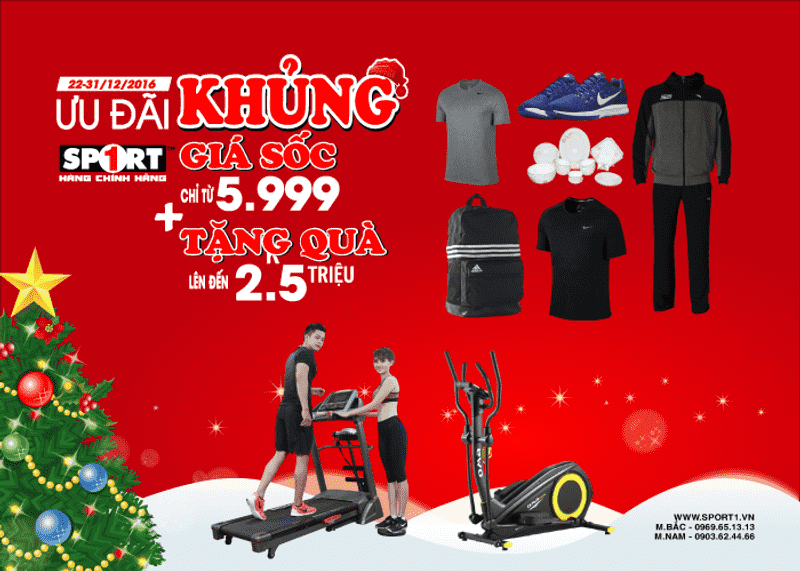 Từ ngày 22/12 đến 31/12 tại tất cả cửa hàng Sport1 bùng nổ ưu đãi MÁY TẬP: Giảm lên đến 30%, giá chỉ từ 5,999,000đ còn tặng thêm những món quà hấp dẫn lên đến 2,5 triệu đồng